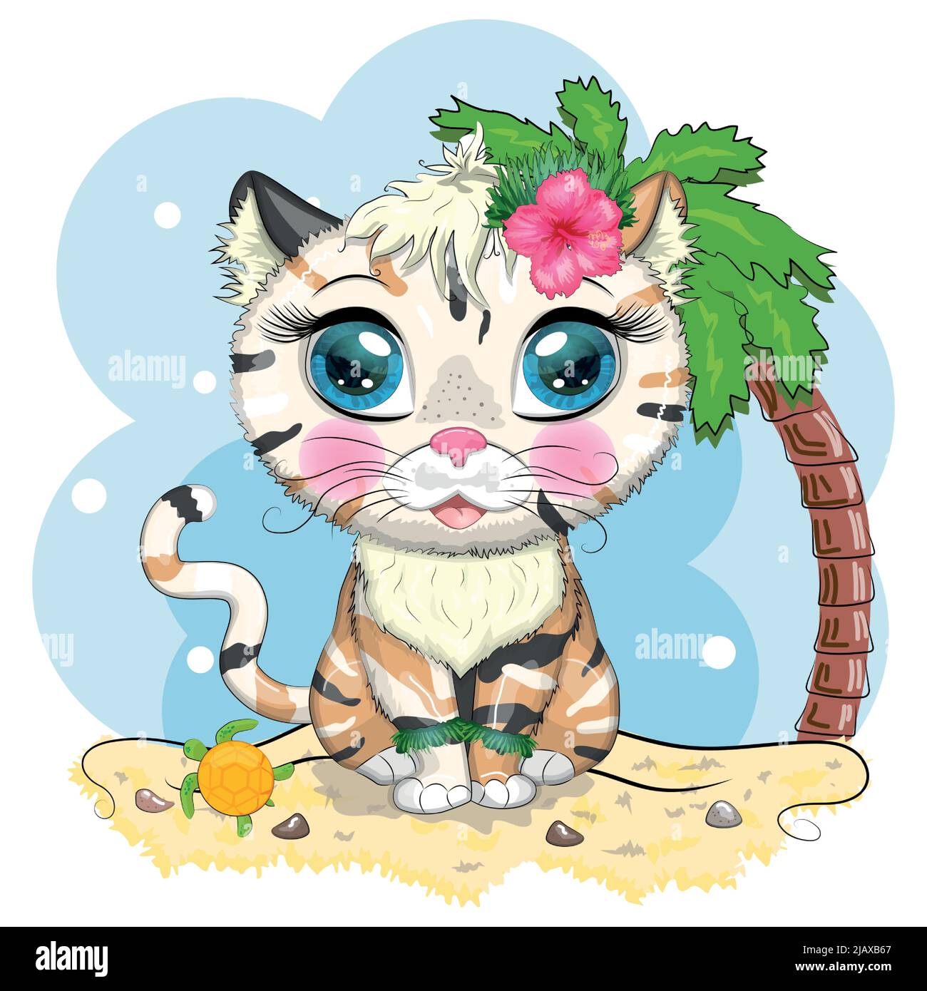 Cartoon cat dressed as a hula dancer under the ukulele, Hawaii .